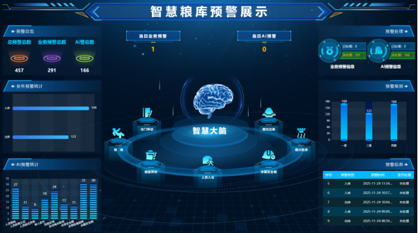针对粮食安全提出问题,通过信息化手段对“出入库作业人员管理”“安全绳及安全锁扣识别”“呼吸器佩戴识别”“出入库粉尘浓度检测”“作业人员步态分析”“安全帽识别”6大场景安全应用预警识别,降低安全事故发生。